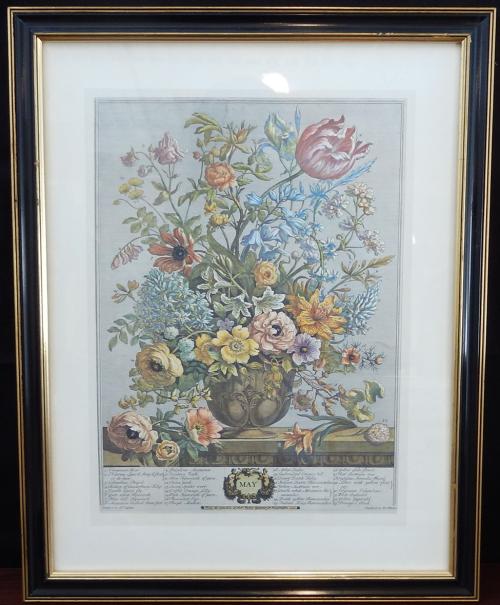 This is a still life work that features a vase full of flowers. Each flower has a number besides it and there is a key at the bottom of the work that has the name of each flower.